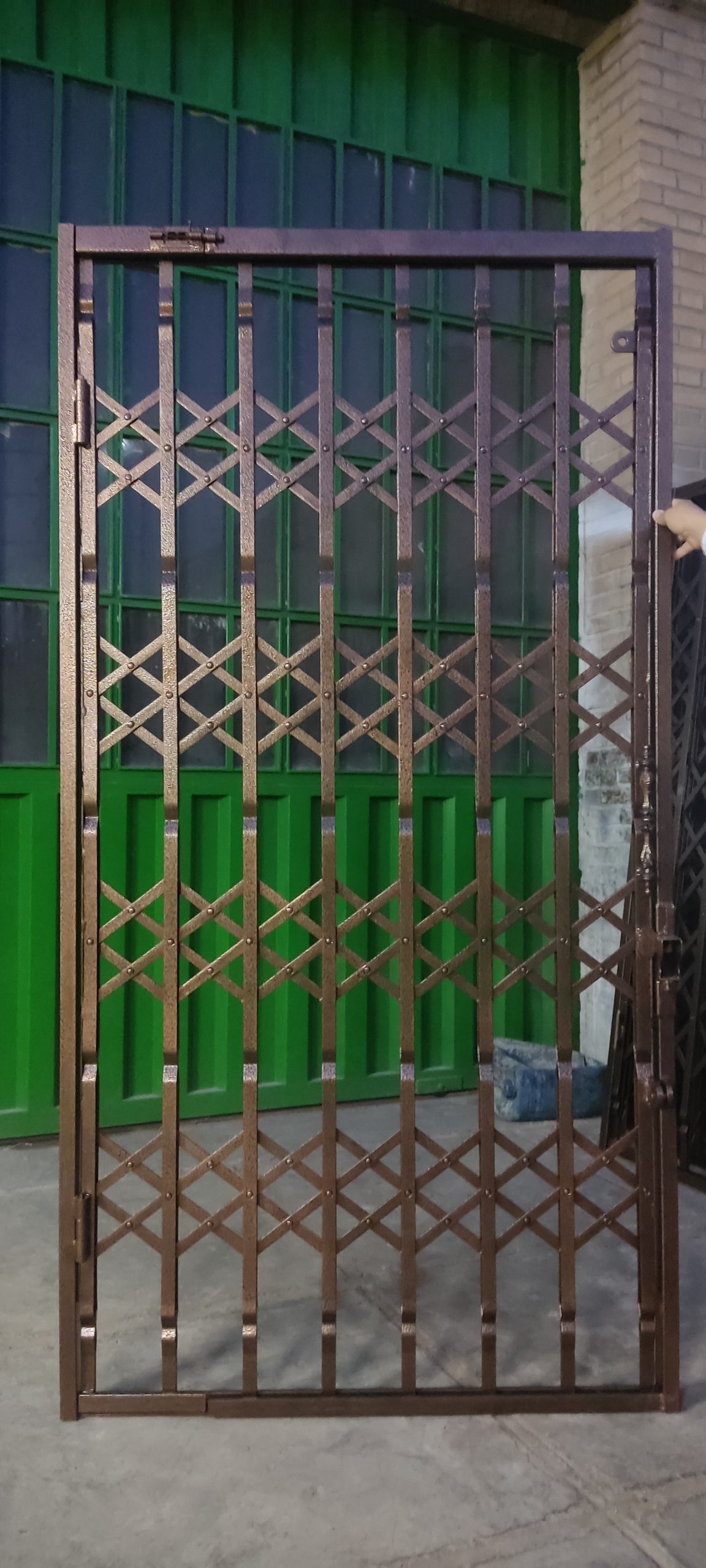 ابعاد:   212*110 چهارچوب: قوطی 30*50 ضخامت 2 میل نوع تسمه: 25*4 رنگ: کوره ای الکترواستاتیک تعداد تیرک عمودی: 9 تیرک فاصله بین تیرک ها :  11.5 سانتی متر تعداد گل: چهار گل لولا: سه پارچه سایز 22 نوع پرچ: مفصل پرچ 6 میلیمتر درجه یک ریل بالا : ورق  با ضخامت 2 میل خم کاری شده ریل پایین: تقویت شده با قوطی 10*30 ضخامت 2 میل جای قفل: دارای یک عدد جای قفل مخفی به صورت ماشین کاری شده ، یک عدد جای قفل آویز با ضخامت 5 میل و یک عدد جای قفل آویز با قابلیت قفل شوندگی از داخل دستگیره: دستگیره چدنی فانتزی سهولت در باز و بسته شدن: به منظور سهولت در باز و بسته شدن درب ها، کلیه ی درب ها دارای دو عدد بلبرینگ درجه یک می باشد. اتصالات: به منظور افزایش ضریب امنیت و جلوگیری از جداسازی تسمه های عمودی کلیه ی اتصالات در محل خم به صورت تمام جوش بوده می باشد. درب آکاردئونی طرح چهار گل گرید B به عنوان یکی دیگر از راهکار های امنیتی موثر است که دارای ضریب امنیت نزدیک به 99 درصد می باشد. این درب دارای دو لایه تسمه عمودی و 4 لوزی بوده به گونه ای که کلیه ی سطح درب را پوشش می دهد و می توان با خیالی آسوده امنیت منازل، اماکن تجاری و اداری را پوشش داد.